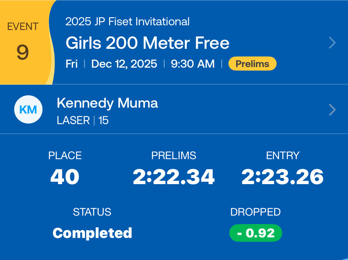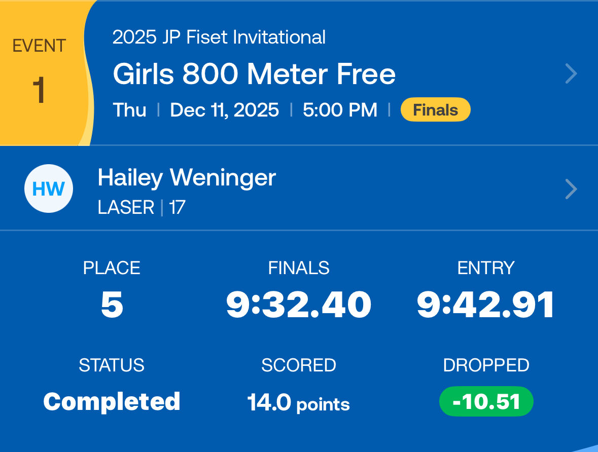 Session #1:Thursday PM - Hailey 800FR Big Best Time, Courageous Swim & Great way to start the meet for our TEAM!
