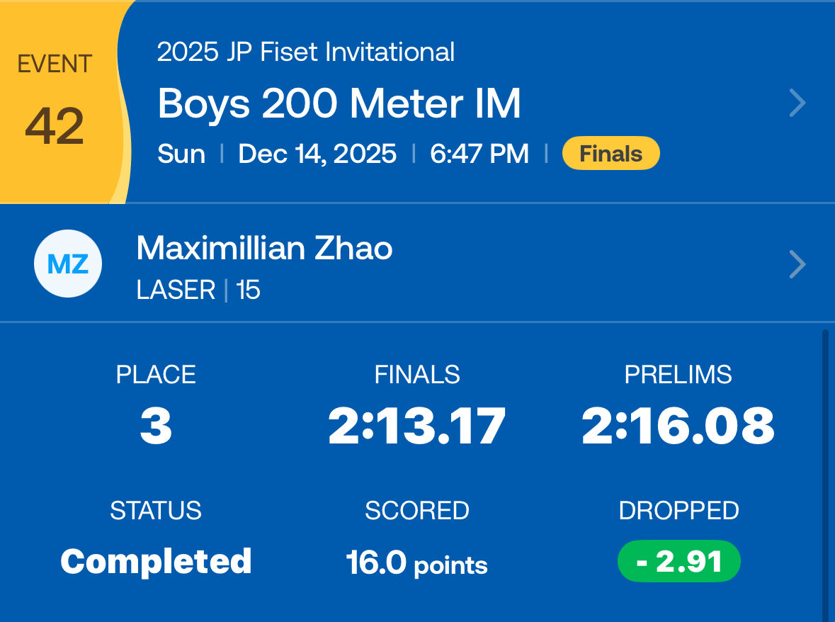 Session #7: Sunday PM - Max 200IM Best Time, Brave Swim (he went out FAST) & BRONZE Medal!