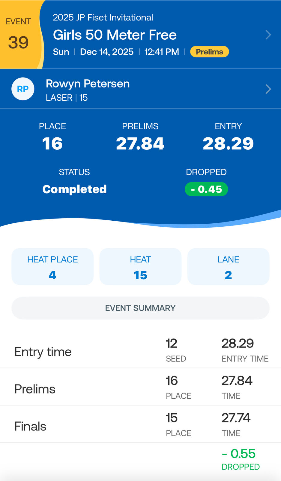 Session #6: Sunday AM - Rowyn 50FR Best Time in Prelims, again in Finals & Breaking 28 both times!