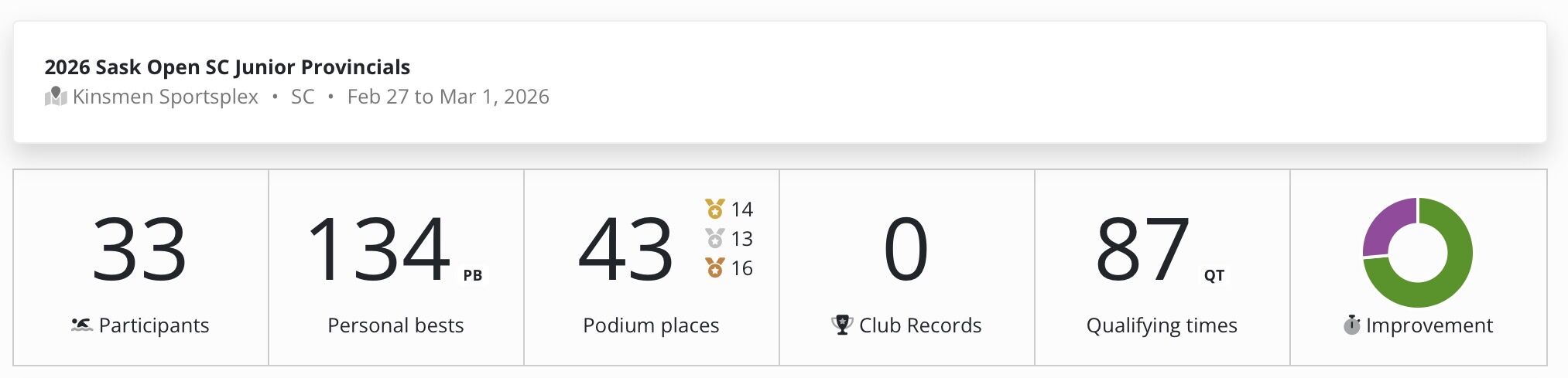 Lasers took 33 athletes south to Moose Jaw to compete at Coach Ryan's favorite meet of the season... Junior Provincial Championships!!! This is a fun meet because for many athletes its their first championship style meet, a great introduction to racing at a higher level, 3 day meet put up against similar leveled athletes from across the province as well as a few from outside Saskatchewan. Our Lasers did an outstanding job representing our TEAM and we got to witness many best times, Podium spots and lots more qualifying times. The podium data below is not entirely correct as the results didn't breakout into each individual category so we actually had many more medals and event winners. Based on the great results as well as taking into account the new rule, where events winners in their age group get an invitation to Man/Sask Championships (regardless of hitting the Man/Sask qual time), we had a few athletes joining our Man/Sask TEAM racing in Winnipeg in a few weeks. Big Congrats to event winners; Mia, Sophie, Kylie, Ally, Kennedy, Nic, Felix and Zeca! Well done TEAM!