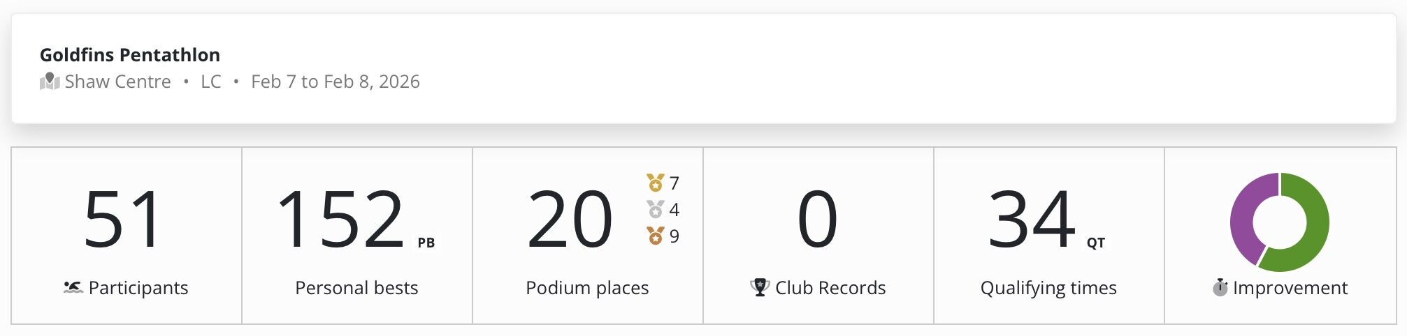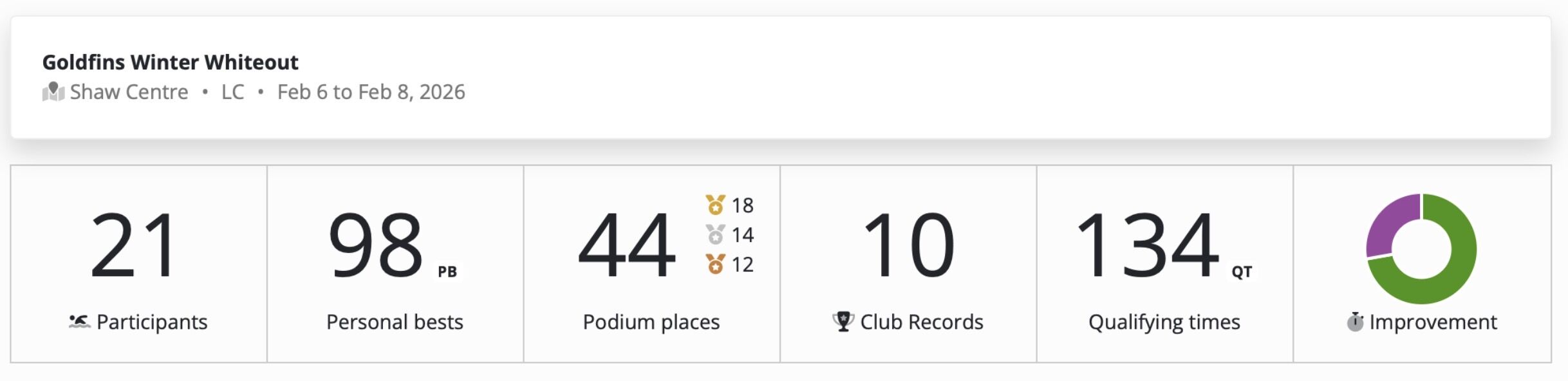 We saw many best times at the Winter Whiteout meet and the Goldfins Pentathlon, including two Canadian Records from Shelby Newkirk and a 7.23-second best time from Max Zhao, putting him less than half a second away from a Trials cut and a couple more athletes locking in some Junior A times so they can compete at that next level. Across both meets, we also saw best times in a wide range of events at both competitions, which is really exciting, which those in our younger groups who are stepping up to race fly. We had a strong number of new A Provincial qualifying times and first-time qualifiers, showing some development across the groups. Performing at this level while carrying fatigue tells us our training is doing exactly what it should—building a strong aerobic base and improving technical and tactical racing skills, while also highlighting the areas we still need to tighten up as we move toward our priority competitions. This sets us up well for an exciting short course season with Junior A Provincials, Man/Sask, and then into the Bridge City Spring Classic that we’re hosting in April.